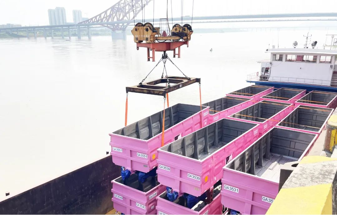 4月26日,一批由中车株洲车辆有限公司生产的矿车从株洲港起运,通过水上航线运输直达江苏转海轮出口澳大利亚。